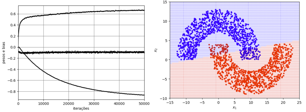 Para exemplificar, vamos considerar novamente o problema de classificação binária com as meias-luas com \(r_1=10\), \(r_2=-4\) e \(r_3=6\), mas agora os rótulos da Região B foram mapeados de \(-1\) para \(0\) a fim de se utilizar as equações obtidas anteriormente com a função logística. Os resultados utilizando o modo de treinamento mini-batch podem ser vistos na Figura 9 e na Figura 10, considerando a minimização do MSE e da EC, respectivamente. Os pesos e bias obtidos na minimização de cada função custo são diferentes, mas a separação das regiões são similares e levam a uma taxa de erro de aproximadamente \(8\%\). Apesar dessa taxa ser um pouco menor que a obtida com o neurônio de Rosenblatt, a separação continua linear.
