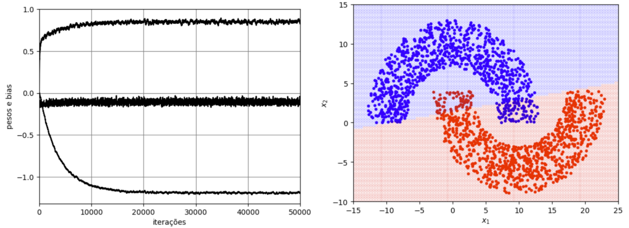 Voltando ao exemplo das meias-luas, vamos considerar agora a solução obtida pelo perceptron de Rosenblatt no modo de treinamento batch com \(M=2\) e considerando \(\eta=10^{-3}\), \(N_t=5000\), \(N_b=N_t\) e \(N_e=50\). Na Figura 5 são mostrados a função custo ao longo das épocas, os dados de teste e a separação linear das regiões no caso de \(r_2=1\). Observa-se neste caso que a função custo converge para zero e a separação obtida proporciona uma solução com taxa de erro nula. Para \(r_2=-4\), uma condição que viola a separabilidade linear, os resultados estão mostrados na Figura 6. Neste caso, observa-se que a função custo não converge mais para zero. Ela varia continuamente, indicando o “colapso” do algoritmo. Isso faz com que parte dos pontos da Região A sejam classificados erroneamente como pertencentes à Região B e vice-versa ao se utilizar os pesos e bias da última iteração, o que leva a uma taxa de erro de aproximadamente \(12\%\).