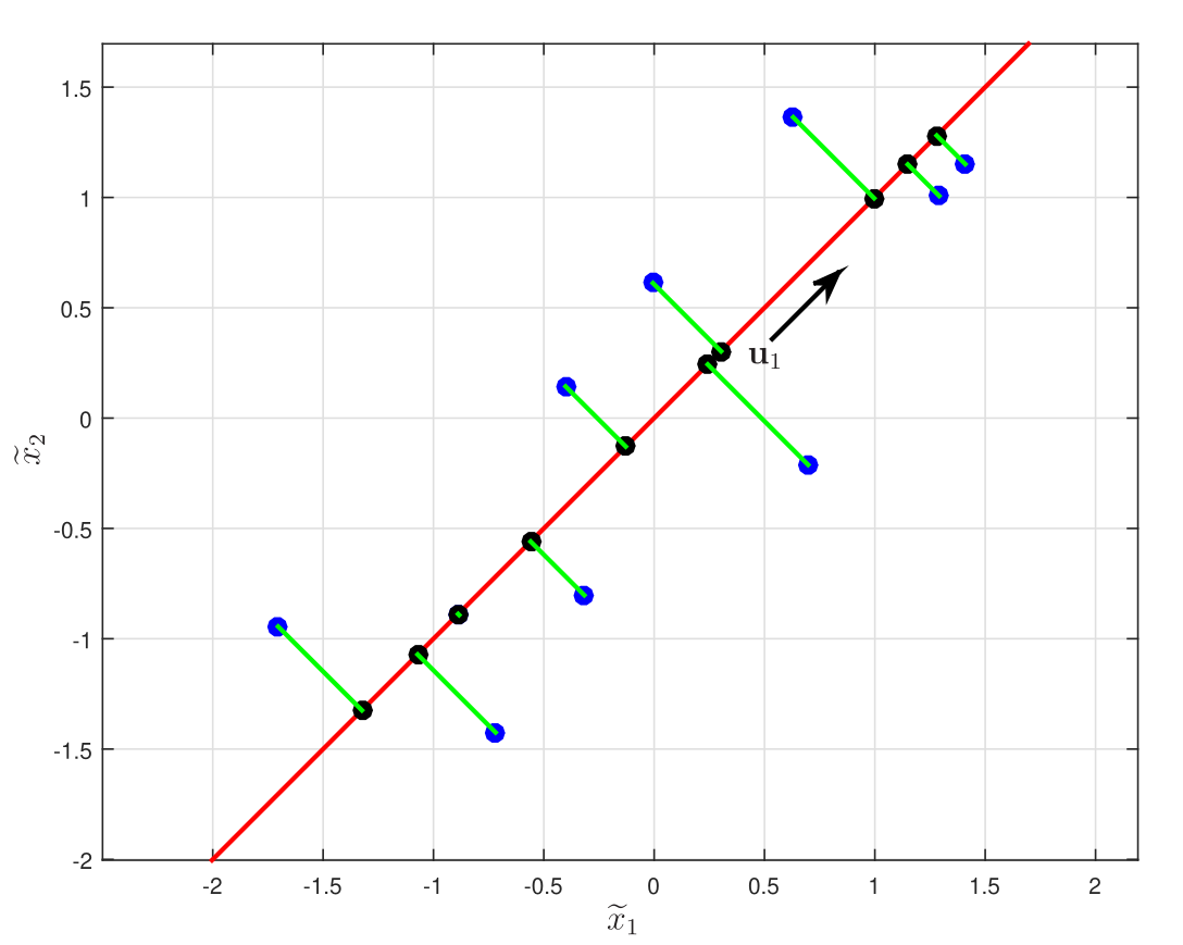 cujos autovalores são \(\lambda_1=1,625\) e \(\lambda_2=0,1750\) e os autovetores de norma unitária associados são \(\mathbf{u}_1=[1/\sqrt{2}\;\;\;\; 1/\sqrt{2}]^{\rm T}\) e \(\mathbf{u}_2=[-1/\sqrt{2}\;\;\;\; 1/\sqrt{2}]^{\rm T}\), respectivamente. Considerando o componente principal \(\mathbf{u}_1\), autovetor associado ao maior autovalor, os dados projetados são calculados como