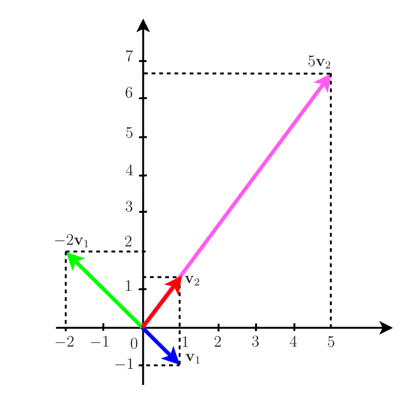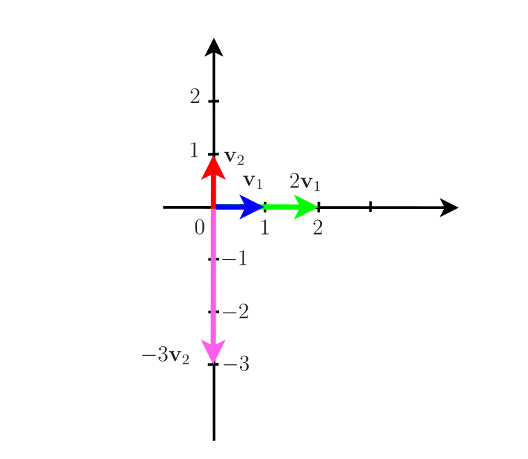 Seja a matriz \[ \AM=\left[ \begin{array}{cr} 2 & 0 \\ 0 & -3 \\ \end{array} \right] \] O polinômio característico de \(\AM\) é $ p()=(2-)(-3-)$. Portanto, os autovalores de \(\AM\) são \(\lambda_1=2\) e \(\lambda_2=-3\). Resolvendo os sistemas de equações \(\AM\, \vM_1=2\vM_1\) e \(\AM\, \vM_2=-3\vM_2\) obtemos os autovetores \(\vM_1=[ 1\,\,0]^T\) e \(\vM_2=[ 0\,\,1]^T\), respectivamente. Na Figura 3, são mostrados os vetores \(\vM_1\) e \(\vM_2\) e as suas projeções no espaço formado pelas colunas da matriz \(\AM\). Como \(\AM\) é uma matriz diagonal, os autovetores coincidem com as coordenadas do espaço Euclidiano.