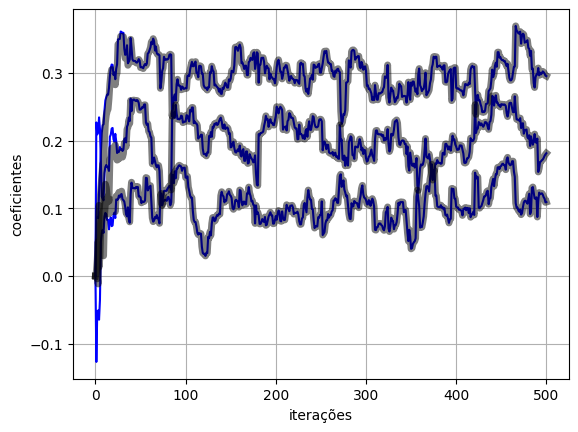 return y, loss, w(y_torch_optim, e_torch_optim, w_torch_optim) = lms_torch_optim(x, d, eta, M)plot_ws(w_torch_optim.numpy(), w_lms)